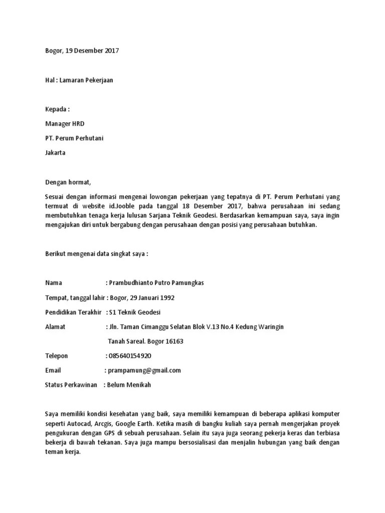Lamaran pegawai tetap perum perhutani pada posisi. Informasi yang anda cari adalah contoh surat lamaran dinas perhutani terupdate dan terlengkap bulan september 2021 dari sumber yang terpercaya. Salah satu berkas penting yang harus dipersiapkan saat melamar kerja adalah surat lamaran pekerjaan. Tidak menggunakan/mengalami ketergantungan terhadap narkotika/sejenisnya;. Pencari kerja sering mengirim surat lamaran dan juga curriculum vitae untuk melamar pekerjaan sebagai cara untuk memperkenalkan diri mereka .